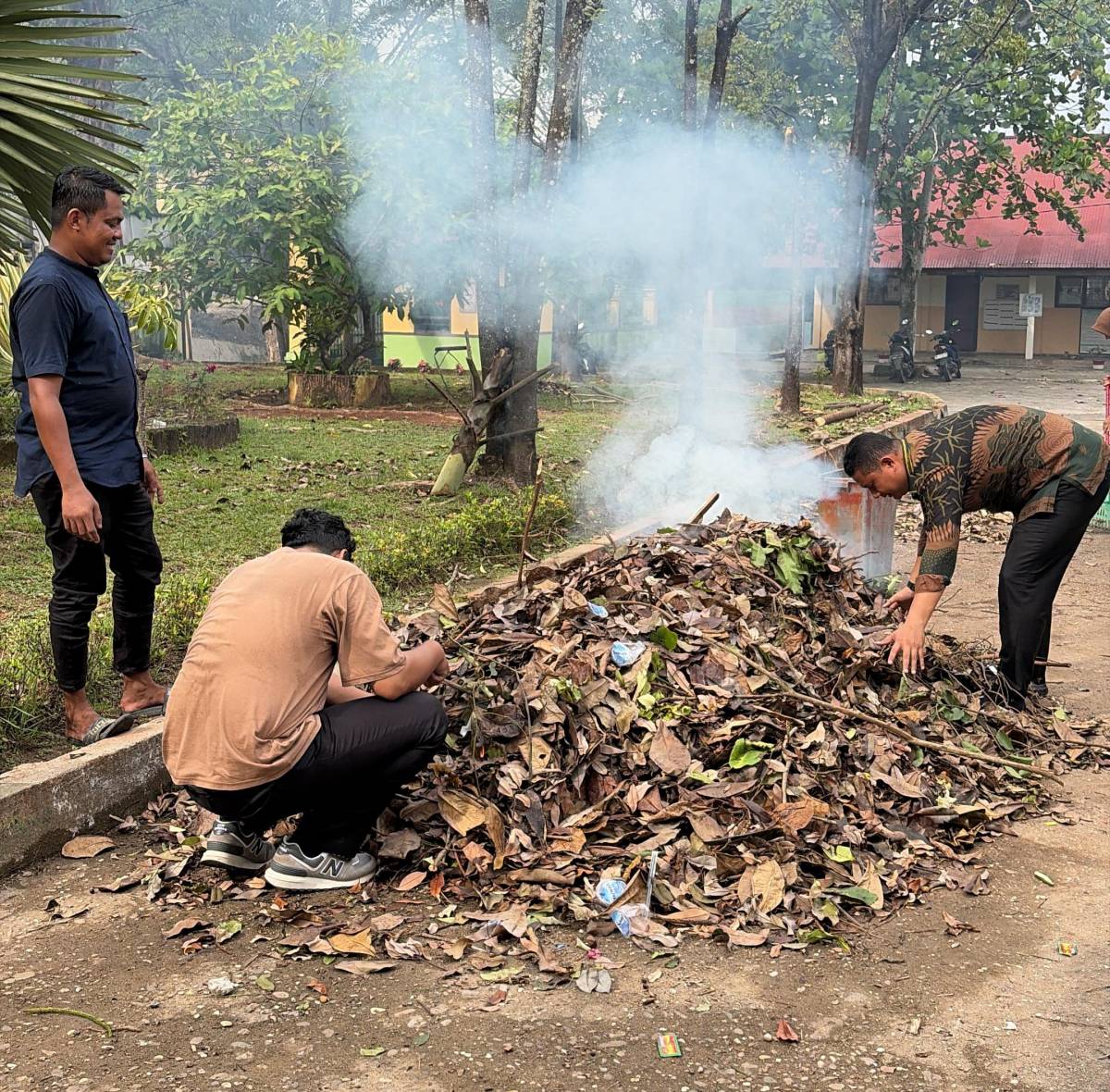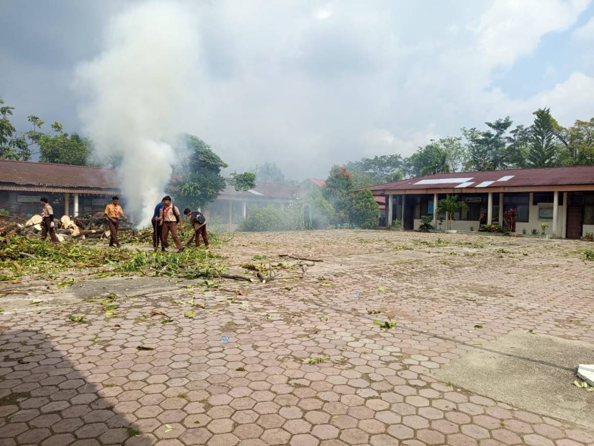 Dalam suasana kebersamaan, para siswa dan guru terlihat membersihkan halaman sekolah dari sampah daun kering. Kegiatan ini bukan sekadar rutinitas kebersihan, tetapi menjadi sarana edukasi langsung tentang pentingnya menjaga lingkungan serta menumbuhkan rasa tanggung jawab bersama.