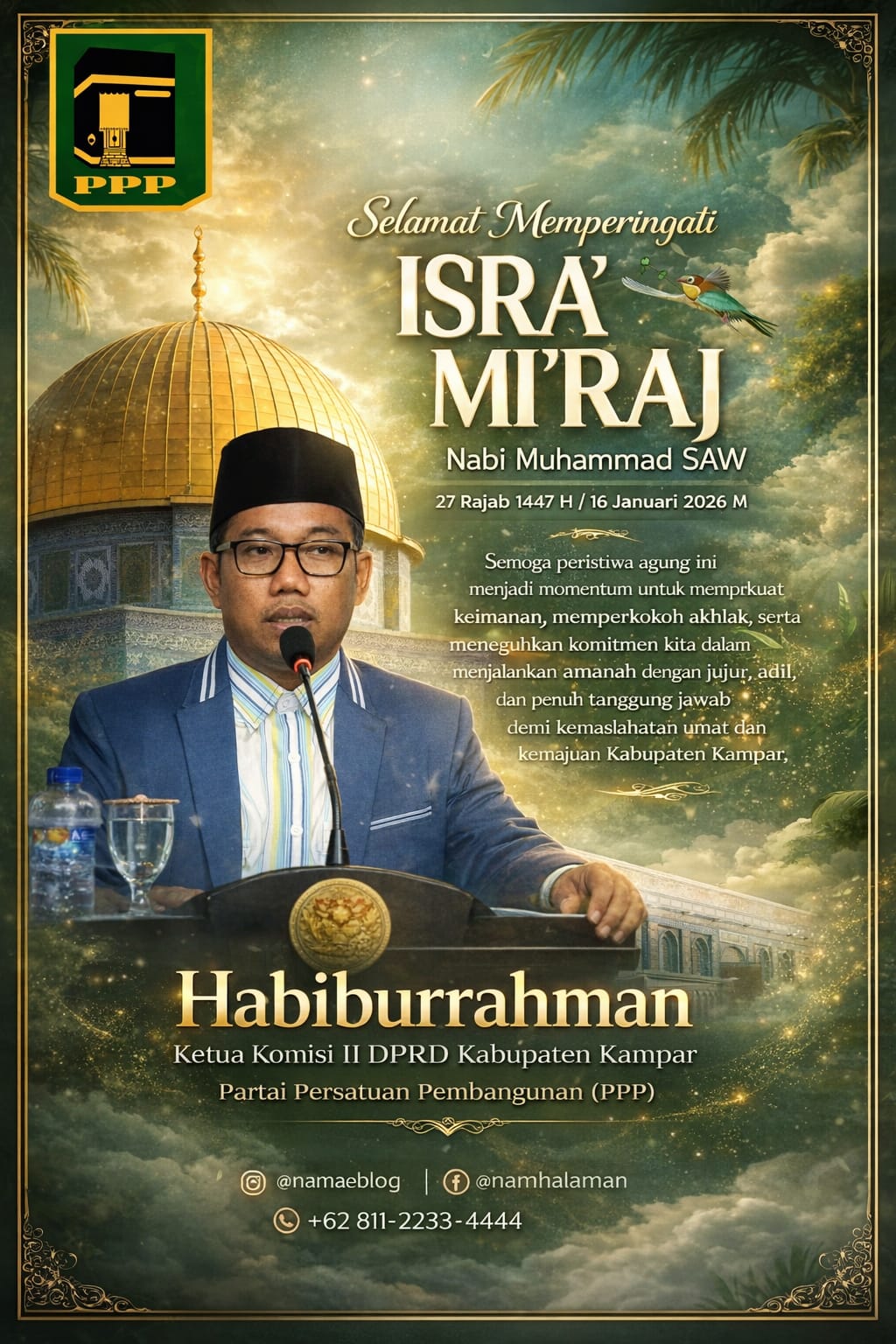KAMPAR – Anggota DPRD Kabupaten Kampar, Habiburrahman, M.Pd, menyampaikan ucapan selamat memperingati Isra Mi’raj Nabi Muhammad SAW 1447 Hijriah kepada seluruh umat Islam, khususnya masyarakat Kabupaten Kampar.